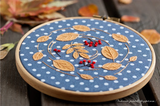 Красота! У Вас очень поэтичная миниатюра вышла. И кружочки на ткани - как первый снег, и расположение листьев и веточек - как будто вьюга закружила...