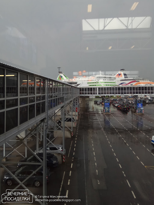 Добрались до порта. Уставшие, промокшие, но довольные. :-) Ждём начала посадки. Наш паром тот, что зелёненький.
