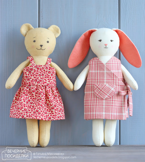 Какие замечательные платья! Сарафанчик для девочки, а вот платье с запахом для мамы (игрушки в нём выглядят более взрослыми, мне так показалось).