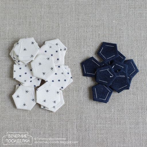 1. Click the link and download the pattern. Print the templates (make sure your printer is set to print «actual size») and cut the templates. Place one hexagonal template on the wrong side of the light cotton scrap, one pentagonal template on the wrong side of the dark cotton scrap (pin if necessary), and cut out the fabric around each template, leaving a 5-7 mm seam allowance around the template.