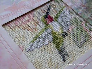 У меня тоже есть этот наборчик, только я его еще не вышила, берегу на случай внезапного подарка. Очень заинтересовал вариант с крестом в две нити, наверно и я так сделаю. Возможно вы не знаете, есть парный к этому дизайн, коллибри с глицинией, тоже заныкано...