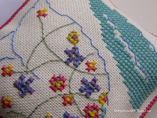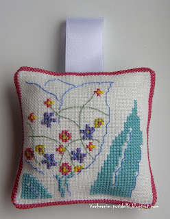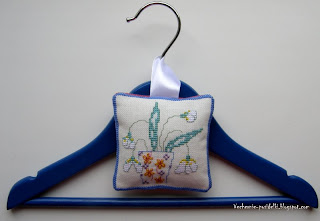 Пришла идея сделать саше, наполненное ароматическими травами для шкафа с одеждой, которое можно подвесить на вешалку. Для дизайна использованы стилизованные первоцветы Дианы Мейчин, которые были разработаны для коллекции открыток (их можно найти в апрельском номере ВК). Когда я их увидела, сразу решила вышить, а уж потом придумала, что мне с ними делать :) Прежде чем наполнить саше травами, их необходимо смешать с синтетическим наполнителем, тогда подушечка будет пухлой и мягкой. Саше двухстороннее.