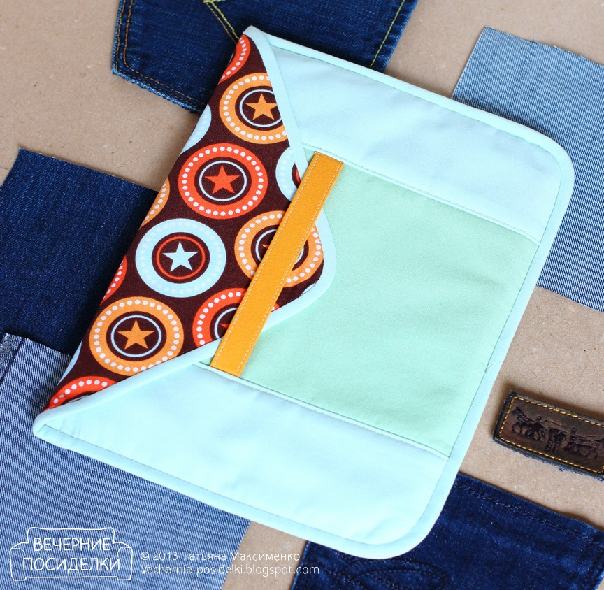 Его вы уже видели, писать много не буду, сходите по ссылке. Именно от него я и заразилась конвертофилией, большое ему спасибо. Это жёсткий конверт, который отлично держит форму. Задумывался как клатч, но и подойдёт для чего-то основательного, например, для планшета или, если размер поменьше сделать, то для смартфона. В мастер-классе есть выкройка и большого (26,5х17см), и маленького (15х9см) варианта, пользуйтесь.