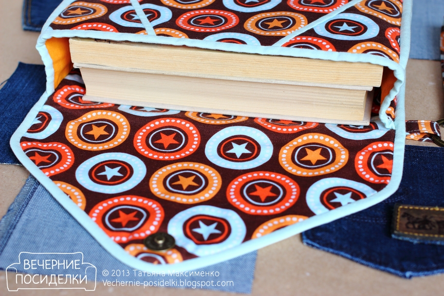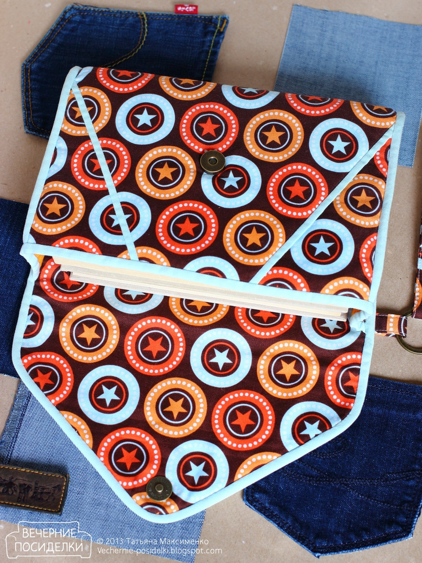 Несмотря на простую конструкцию, вышла она у меня только со второй попытки. Первая выкройка оказалось неудачной — клапан был с каким-то несимпатичным углом и тетради не влезали. Сначала и в голову не пришло, что её можно будет использовать для тетрадей. Так что всё переделала, от первой папки остался оранжевый хлястик. :-) Клапан просто просовывается под хлястик, при желании, можно пришить и кнопку. Окантовывающая бейка такая же тонкая, как и на объёмном конверте. Размер 26х19см.