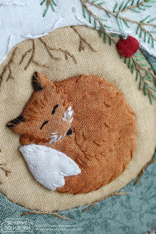 Лисы роют норы (а часто и не роют вовсе, а хитрюги приватизируют барсучьи) в корнях деревьев, поэтому в норе вышитые корни, а над входом свешивается еловая веточка — и очень кстати, ведь её как раз можно украсить шариками к празднику. Сверху намело шапку из снега.