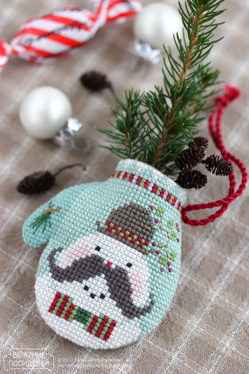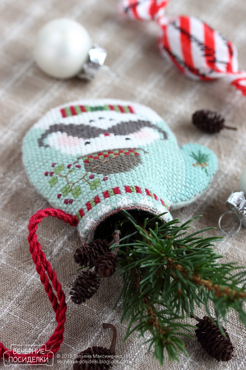 А вот и вышивка — маленькая варежка, уже неделю на ёлке висит, успела прижиться. Это пополнение в моей коллекции «вышито-сшитых» варежек — новинка от Cricket Collection с щеголеватым усатым снеговиком в котелке, похожим на... Эркюля Пуаро. :-) Схема бесплатная, можно скачать и ещё успеть вышить до Нового года.