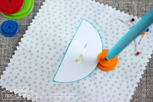 Вставляю в отверстие кругляша нужного мне размера (в данном случае 5мм) карандаш или маркер и завожу кругляш под выкройку так, чтобы она попала в паз и упёрлась.