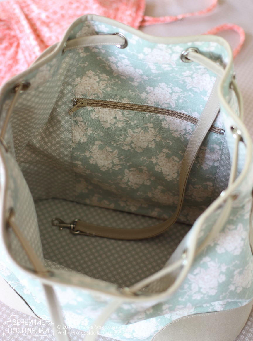 Шнур, вставленный в люверсы — классика жанра для бакета. Шнур завязывать не нужно, достаточно затянуть... эээ... а как, кстати, правильно называется эта штучка? Верх сумки также, как и у первой сумки, более плотный, чем стенки, хорошо драпируется и держит форму.