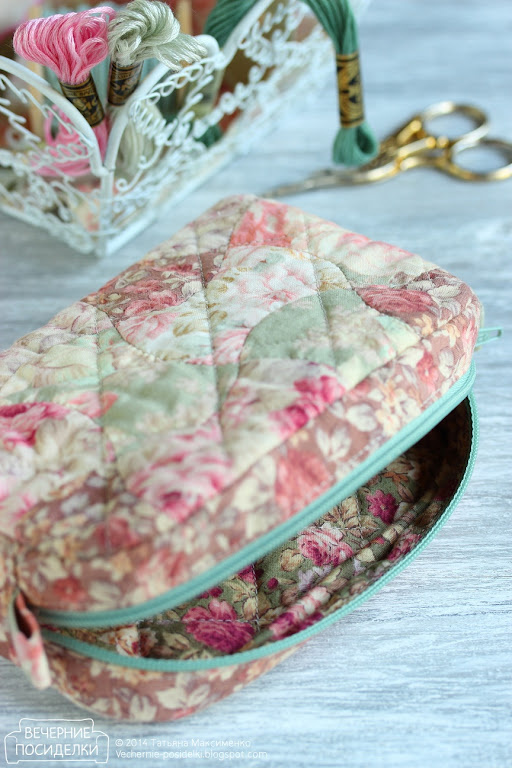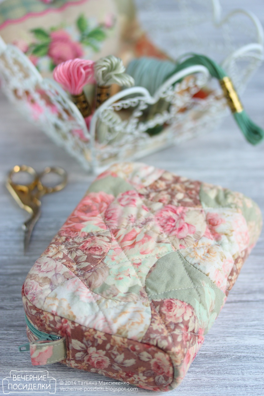 Таня, прекрасное сочетание тканей. Я тоже не поняла, что это из кусочков - пересматривала фотографии внимательнее уже после прочтения поста))) Фотографии шикарные, ажурная вазочка для ниток, сердечко и героиня поста косметичка - все такое женственное, нежное, уютное. Нравится-нравится!