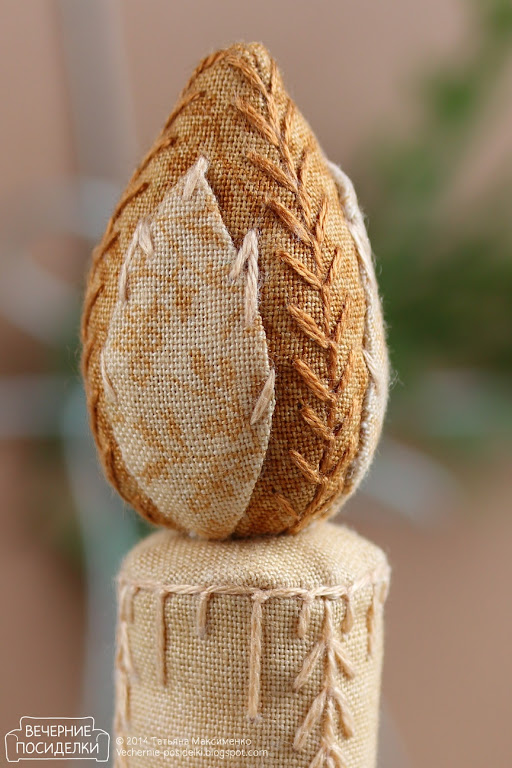 Свеча расшита декоративными швами для большей нарядности в стиле прошлогодних игрушек: жёлудя, шишки, колокольчика и грибочка.