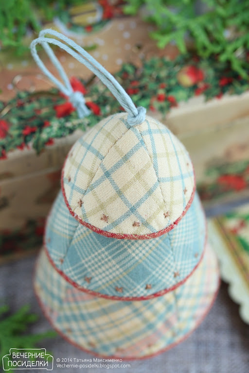 Если так пойдёт и дальше, придётся ставить три ёлки, чтобы все игрушки развесить. :-) Сегодня ёлочка на ёлочку. До сих пор у меня не было ни одной сшитой, главный символ Нового года всё время обходила стороной. Исправилась. Получилась вот такая, напоминает мне многоярусный колокольчик. Динь-дон! Хотя навеяна она вовсе не колокольчиком, а шишкой и немного деревянной пирамидкой, где на палочку основание одевались кольца разного размера. Помните такие? :-)