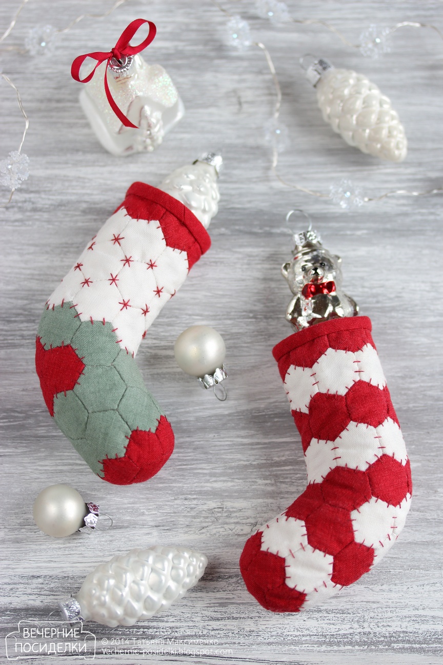 Диаметр носочков — 3см, высота около 10см. Носочки на подкладке, верх окантован тонкой бейкой. Никак не могу решить, как лучше вешать их на ёлку: на верёвочках или на прищепках, поэтому сфотографировала пока без всего, буду сегодня определяться по ходу дела.