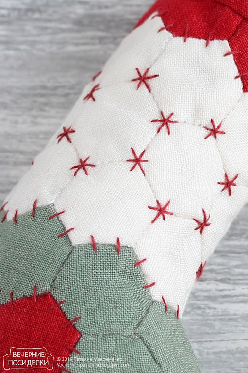 Носочки собраны вручную из шестиугольников и нескольких пятиугольников, которые потребовались для придания нужной формы (в вязании это кажется называется «убавки»?) Для каждого носочка понадобилось чуть больше пятидесяти лоскутков со сторонами 1см.