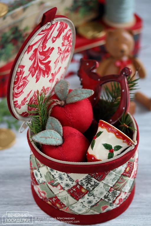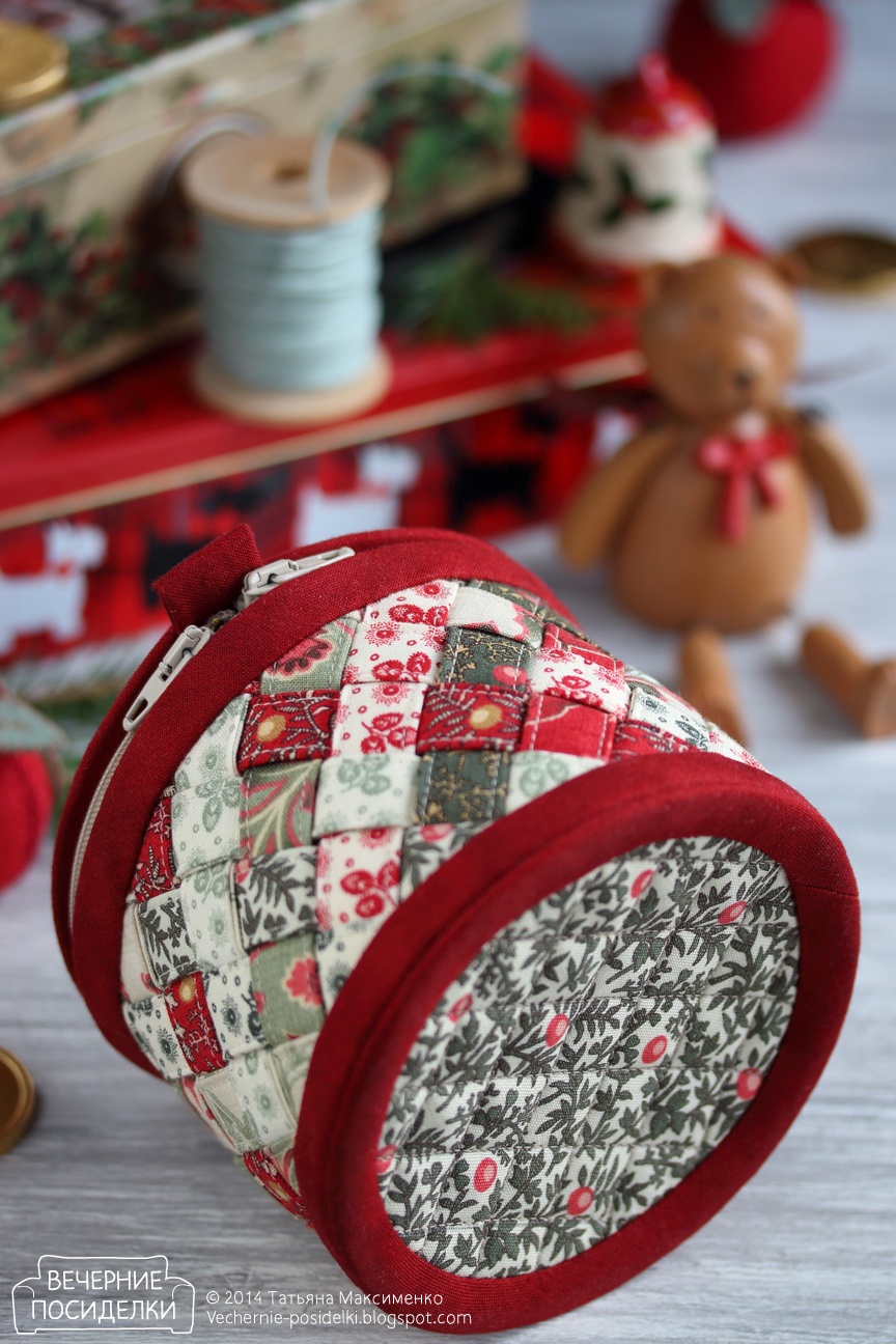 Любите ли вы косметички, шкатулочки и прочие хранилища для всяких нужностей так, как люблю их я? :-) Всё-таки это чудеснейший объект для экспериментов. Сегодня правда никаких экспериментов, а тот крайне редкий случай, когда я шью что-то повторно. Эта новогодняя плетёночка в традиционных красно-зелёных цветах — почти полный близнец осенней шкатулки, только размеры слегка отличаются, предыдущая казалась мне высоковатой для её диаметра, эту сделала чуть-чуть пониже и чуть-чуть пошире.