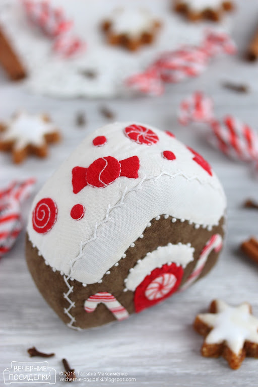 Пряничные домики я, кстати, ни разу не пекла, а вот сшить давно хотела. Этот домик — ёлочная игрушка, просто фотографировался ещё без верёвочки (уже пришила). Размер домика: 8х8,5см, глубина 4см.