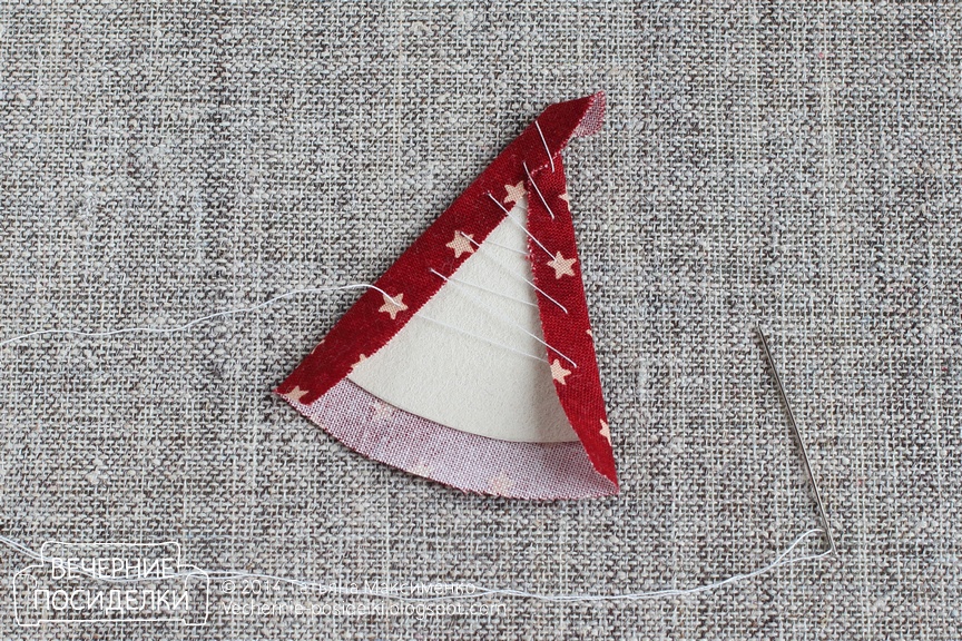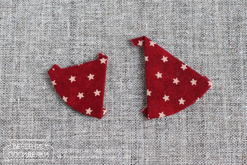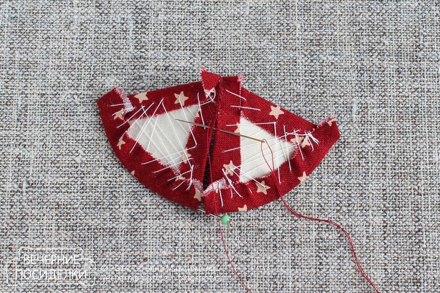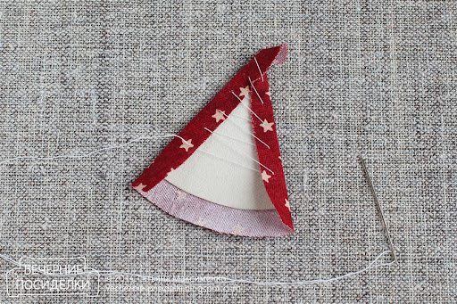 4. Сложите две маленькие детали и сшейте прямые стороны вручную с изнаночной стороны. Захватывайте только ткань, находящуюся над флизелином. Хорошо затягивайте стежки.